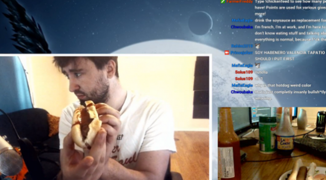 Then, finally, a glimmer of hope when I got to Princejafarr’s channel, which advertised that I could, live, watch someone “PUTTING GROSS STUFF ON HOTDOGS.” Exactly what I’ve been looking for! I told myself, mostly because I didn’t want to keep looking for something better.